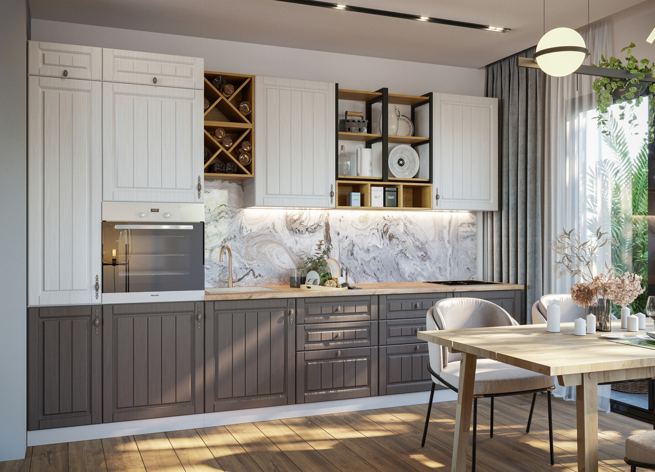 Срокойный светлые оттенки фасадов из МДФ с фрезеровкой и покрытые пленкой ПВХ. Изящные ручки в цвете бронза, модули со стеклом - все подчеркивает изысканный вкус хозяйки и стиль кухни.